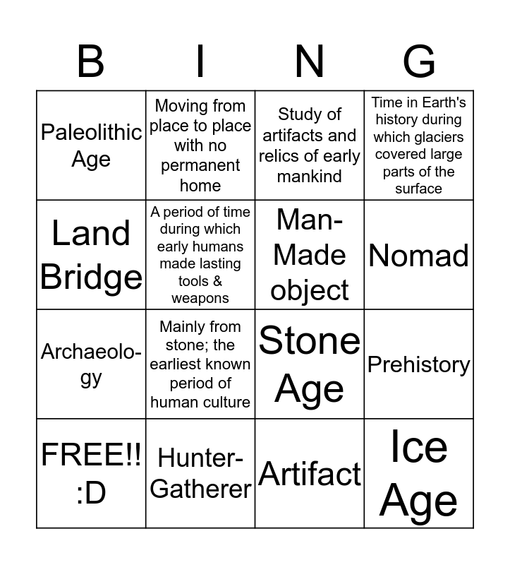 This bingo card has 16 words: Hunter- Gatherer, Prehistory, Study of artifacts and relics of early mankind, Paleolithic Age, Archaeolo-gy, Moving from place to place with no permanent home, Stone Age, Artifact, Land Bridge, A period of time during which early humans made lasting tools & weapons, FREE!! :D, Time in Earth's history during which glaciers covered large parts of the surface, Mainly from stone; the earliest known period of human culture, Nomad, Man-Made object and Ice Age.