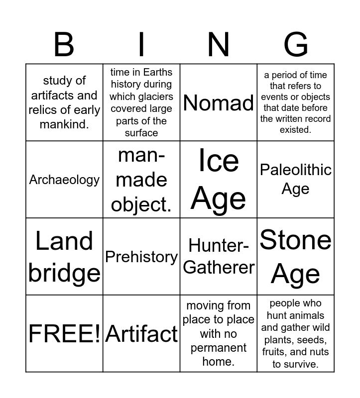 This bingo card has 16 words: Artifact, Stone Age, Nomad, study of artifacts and relics of early mankind., Land bridge, time in Earths history during which glaciers covered large parts of the surface, Hunter-Gatherer, moving from place to place with no permanent home., Archaeology, man-made object., FREE!, a period of time that refers to events or objects that date before the written record existed., Prehistory, Paleolithic Age, Ice Age and people who hunt animals and gather wild plants, seeds, fruits, and nuts to survive..