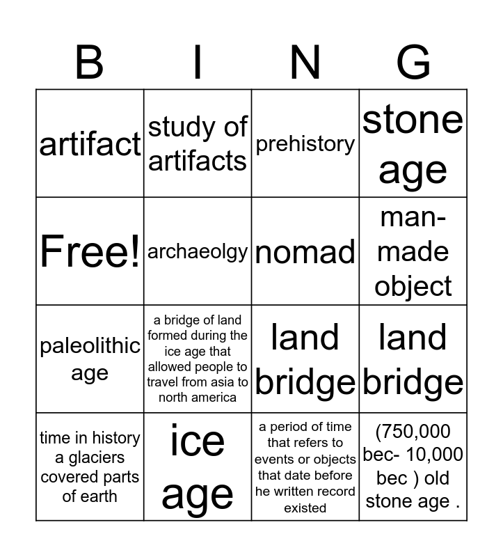 This bingo card has 16 words: ice age, land bridge, prehistory, artifact, paleolithic age, study of artifacts, land bridge, a period of time that refers to events or objects that date before he written record existed, Free!, archaeolgy, time in history a glaciers covered parts of earth, stone age, a bridge of land formed during the ice age that allowed people to travel from asia to north america, man-made object, nomad and (750,000 bec- 10,000 bec ) old stone age ..