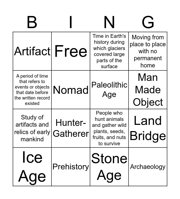 This bingo card has 16 words: Prehistory, Land Bridge, Time in Earth's history during which glaciers covered large parts of the surface, Artifact, Study of artifacts and relics of early mankind, Free, People who hunt animals and gather wild plants, seeds, fruits, and nuts to survive, Stone Age, A period of time that refers to events or objects that date before the written record existed, Nomad, Ice Age, Moving from place to place with no permanent home, Hunter-Gatherer, Man Made Object, Paleolithic Age and Archaeology.