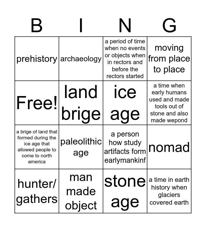 This bingo card has 16 words: man made object, nomad, a period of time when no events or objects when in rectors and before the rectors started, prehistory, a brige of land that formed during the ice age that allowed people to come to north america, archaeology, a person how study artifacts form earlymankinf, stone age, Free!, land brige, hunter/ gathers, moving from place to place, paleolithic age, a time when early humans used and made tools out of stone and also made wepond, ice age and a time in earth history when glaciers covered earth.