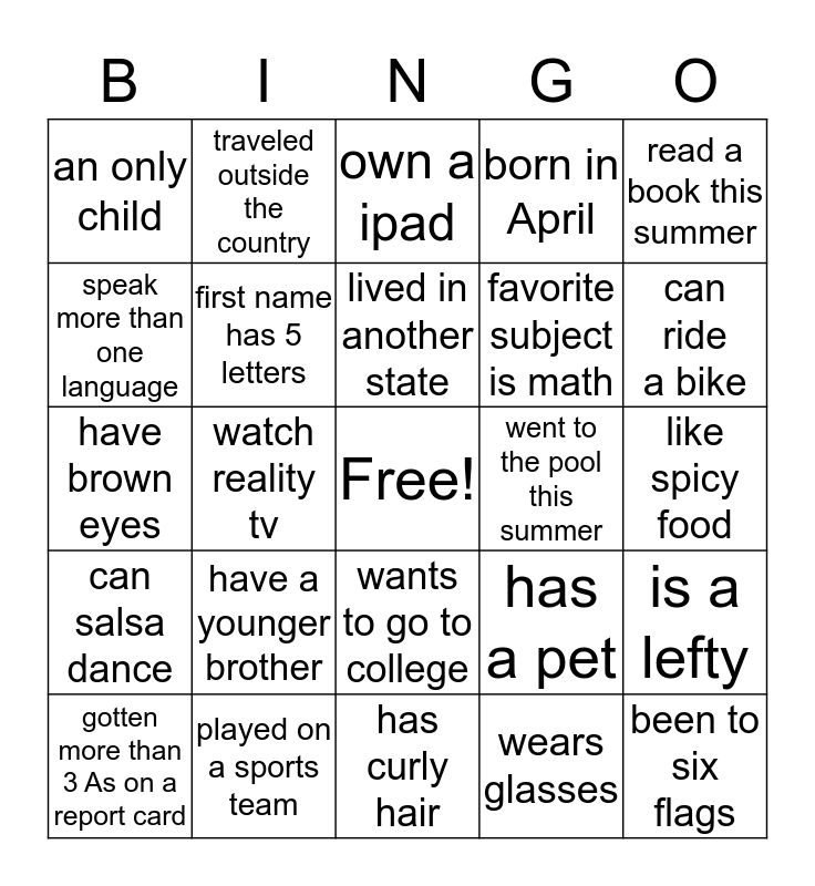 This bingo card has a free space and 24 words: have a younger brother, played on a sports team, lived in another state, gotten more than 3 As on a report card, read a book this summer, an only child, speak more than one language, traveled outside the country, went to the pool this summer, wants to go to college, favorite subject is math, have brown eyes, has a pet, is a lefty, first name has 5 letters, wears glasses, like spicy food, own a ipad, can ride a bike, watch reality tv, been to six flags, can salsa dance, born in April and has curly hair.