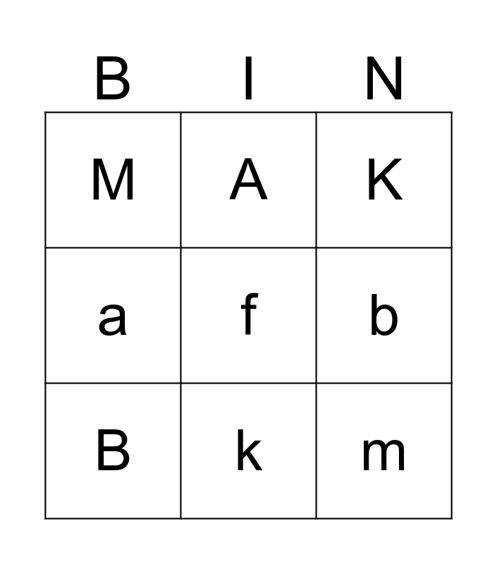 This bingo card has 9 words: B, K, A, a, M, b, f, m and k.