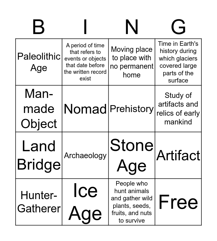 This bingo card has 16 words: Ice Age, Artifact, Moving place to place with no permanent home, Paleolithic Age, Land Bridge, A period of time that refers to events or objects that date before the written record exist, Stone Age, People who hunt animals and gather wild plants, seeds, fruits, and nuts to survive, Man-made Object, Nomad, Hunter-Gatherer, Time in Earth's history during which glaciers covered large parts of the surface, Archaeology, Study of artifacts and relics of early mankind, Prehistory and Free.