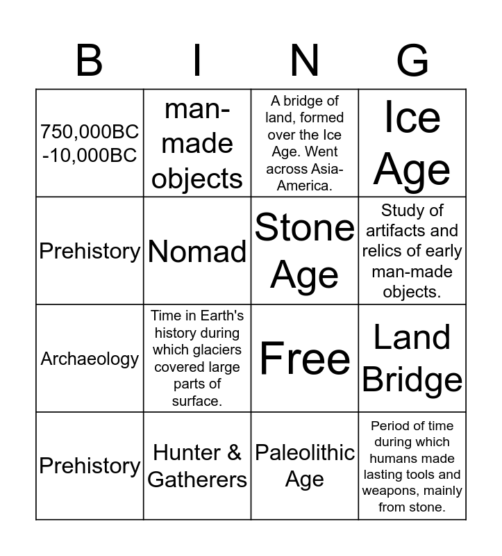 This bingo card has 16 words: Hunter & Gatherers, Land Bridge, A bridge of land, formed over the Ice Age. Went across Asia-America., 750,000BC -10,000BC, Archaeology, man-made objects, Free, Paleolithic Age, Prehistory, Nomad, Prehistory, Ice Age, Time in Earth's history during which glaciers covered large parts of surface., Study of artifacts and relics of early man-made objects., Stone Age and Period of time during which humans made lasting tools and weapons, mainly from stone..