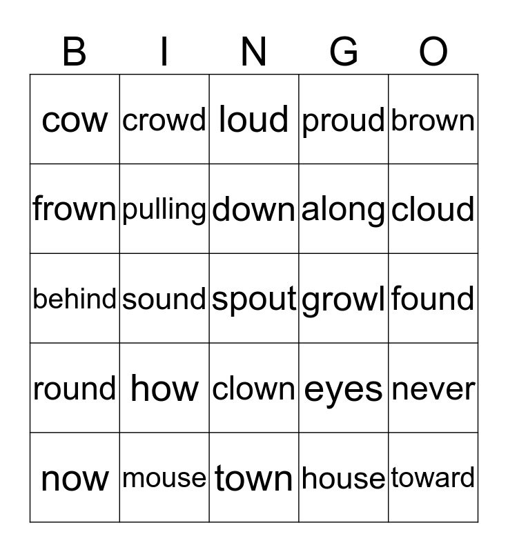 This bingo card has 25 words: how, town, down, now, brown, cow, frown, crowd, growl, clown, along, behind, eyes, never, pulling, toward, found, loud, cloud, sound, spout, mouse, round, proud and house.