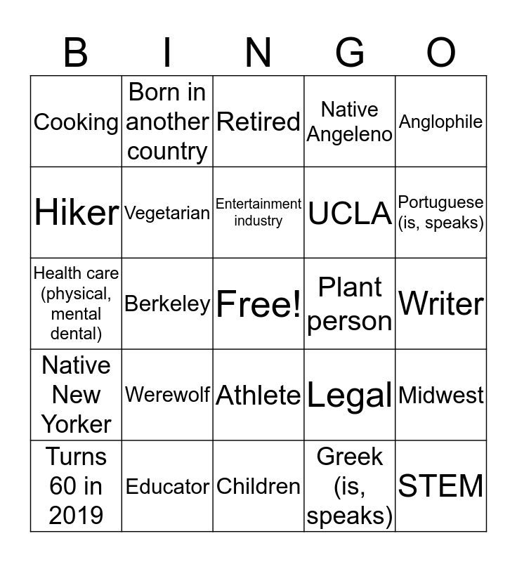 This bingo card has a free space and 29 words: Turns 60 in 2019, Master's Degree, Berkeley, Art/Design, Cooking, Retired, Vegetarian, Werewolf, Plant person, Educator, Writer, STEM, Children, Greek (is, speaks), Portuguese (is, speaks), Italian (is, speaks), Athlete, Native New Yorker, Anglophile, Health care (physical, mental dental), Legal, Cat person, UCLA, Hiker, Native Angeleno, Born in another country, Midwest, Entertainment industry and Music (sings, composes).