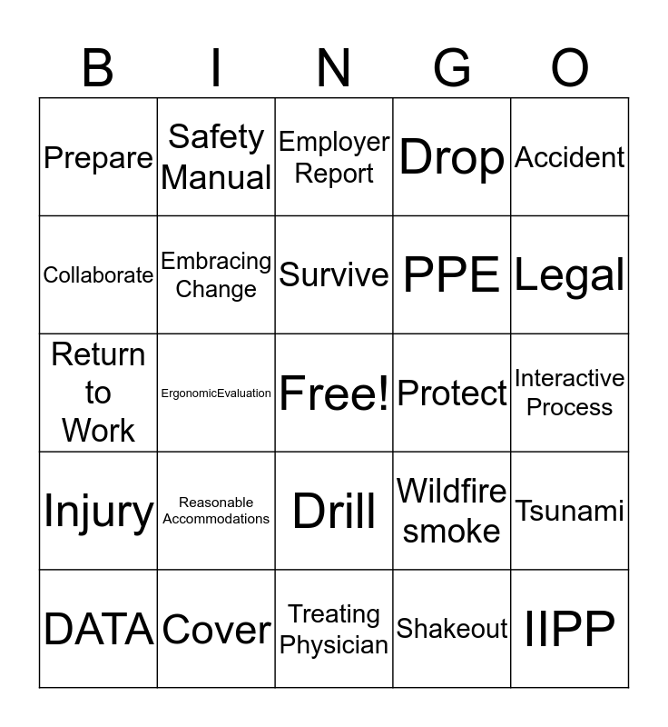 This bingo card has a free space and 29 words: DATA, CalOSHA, ErgonomicEvaluation, Modified Work, Prepare, Employer Report, Embracing Change, Reasonable Accommodations, Protect, Cover, Interactive Process, IIPP, Treating Physician, Shakeout, Legal, Sharps Log, Drill, Injury, Accident, Return to Work, Wildfire smoke, Work Restrictions, PPE, Collaborate, Drop, Safety Manual, Tsunami, Survive and EAP.