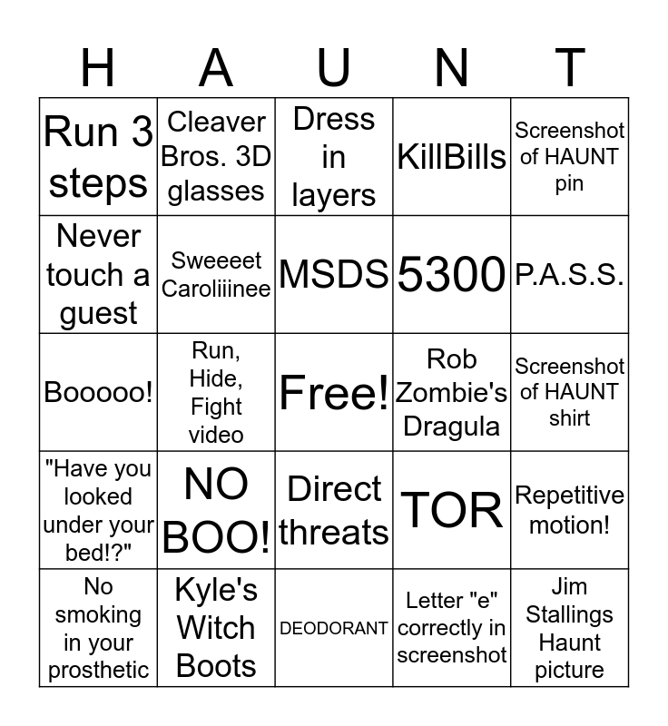 This bingo card has a free space and 24 words: NO BOO!, Kyle's Witch Boots, MSDS, No smoking in your prosthetic, Screenshot of HAUNT pin, Run 3 steps, Never touch a guest, Cleaver Bros. 3D glasses, Rob Zombie's Dragula, Direct threats, 5300, Booooo!, TOR, Repetitive motion!, Sweeeet Caroliiinee, Letter "e" correctly in screenshot, Screenshot of HAUNT shirt, Dress in layers, P.A.S.S., Run, Hide, Fight video, Jim Stallings Haunt picture, "Have you looked under your bed!?", KillBills and DEODORANT.
