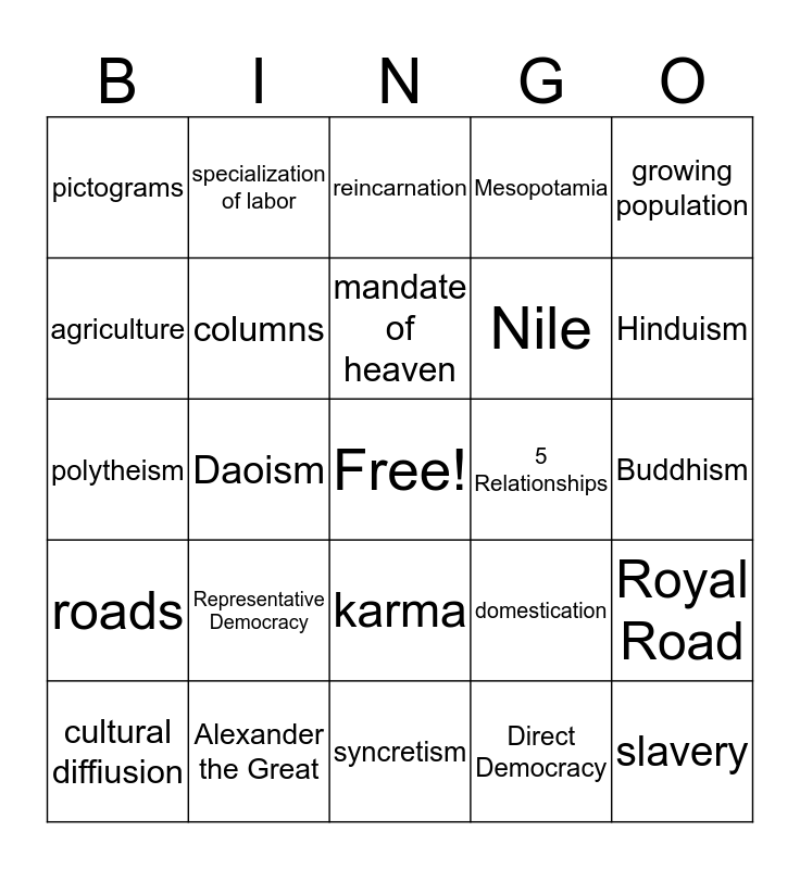 This bingo card has a free space and 42 words: pharoah, mandate of heaven, Julius Caesar, Representative Democracy, Direct Democracy, Royal Road, slavery, diaspora, reincarnation, karma, Buddhism, Hinduism, Daoism, growing population, egalitarian, domestication, Eastern Mediterranean, polytheism, monotheism, specialization of labor, agriculture, clean water source, patriarchy, pictograms, Yellow, Tigris and Euphrates, Nile, Indus, Shang, cuneiform, oracle bones, roads, columns, syncretism, Hellenism, cultural diffiusion, Alexander the Great, 5 Relationships, civil service exam, Confucianism, Mesopotamia and Hammurabi.