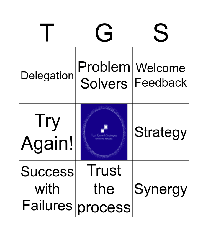 This bingo card has a free space and 8 words: Strategy, Welcome Feedback, Problem Solvers, Success with Failures, Delegation, Synergy, Try Again! and Trust the process.