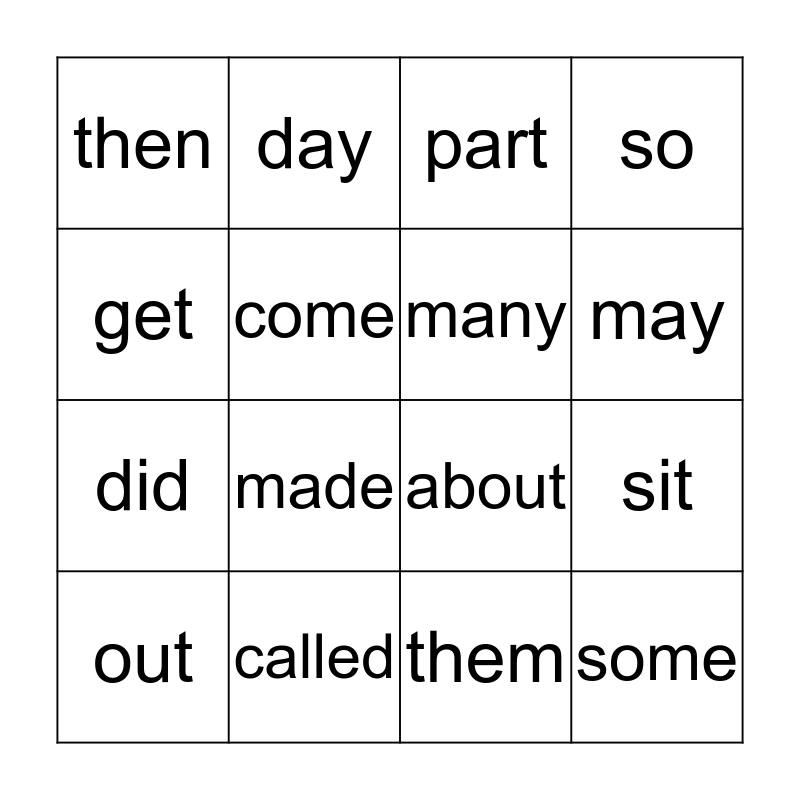 This bingo card has 16 words: called, sit, part, then, did, day, about, them, get, come, out, so, made, may, many and some.