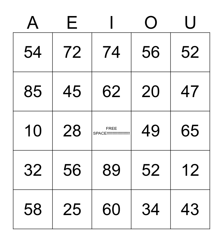 This bingo card has a free space and 24 words: 56, 25, 62, 58, 52, 54, 85, 72, 49, 89, 20, 10, 52, 12, 45, 34, 65, 74, 47, 28, 43, 32, 56 and 60.