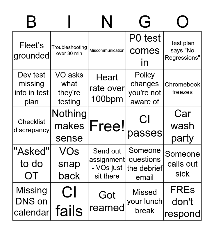 This bingo card has a free space and 24 words: VOs snap back, CI fails, Heart rate over 100bpm, Missing DNS on calendar, Test plan says "No Regressions", Fleet's grounded, Dev test missing info in test plan, Troubleshooting over 30 min, CI passes, Send out assignment - VOs just sit there, Policy changes you're not aware of, Checklist discrepancy, Someone questions the debrief email, Someone calls out sick, VO asks what they're testing, Missed your lunch break, Car wash party, Miscommunication, Chromebook freezes, Nothing makes sense, FREs don't respond, "Asked" to do OT, P0 test comes in and Got reamed.
