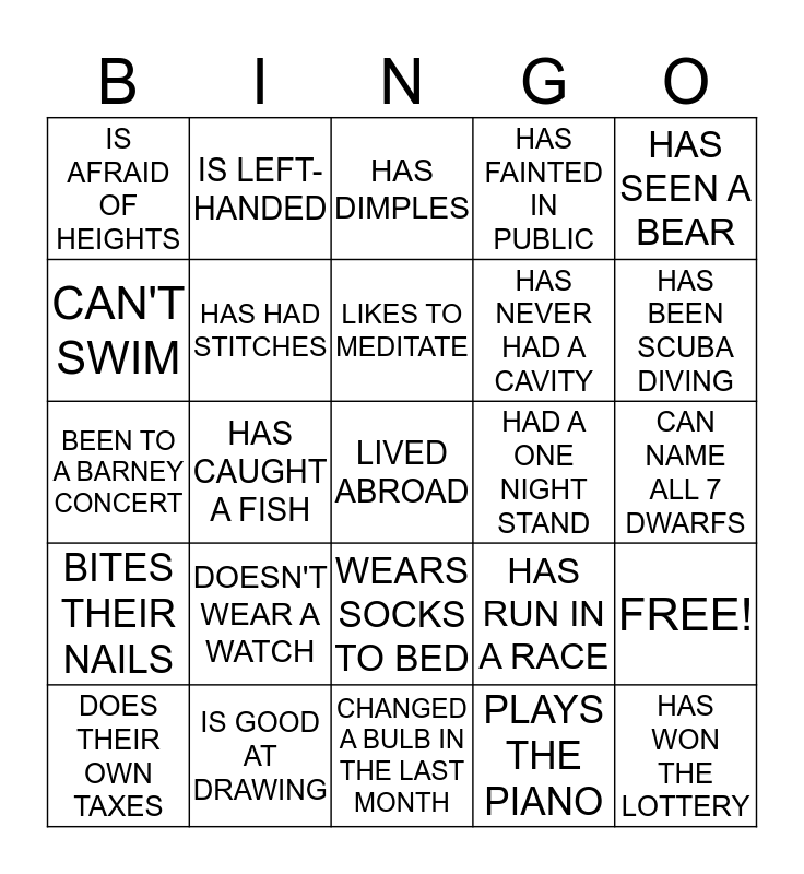 This bingo card has 49 words: CAN PLAY GUITAR, LIVED ABROAD, HAS BEEN IN A PARADE, CHANGED A BULB IN THE LAST MONTH, DOESN'T WEAR A WATCH, HAS GOTTEN A SPEEDING TICKET, IS LEFT-HANDED, USES PLASTIC COUCH COVERS, CAN'T SWIM, WORE HEAD GEAR, HAS HAD STITCHES, HAS FAINTED IN PUBLIC, FREE!, HAS RUN IN A RACE, OWNS A YOGA MAT, GONE ON A BLIND DATE, LIKES TO MEDITATE, HAD A ONE NIGHT STAND, DOESN'T EAT TURKEY, HAS SEEN A BEAR, HAS CAUGHT A FISH, PLAYS THE PIANO, IS AFRAID OF HEIGHTS, HAS NEVER HAD A CAVITY, HAS PLANTED A TREE, HAS BEEN SCUBA DIVING, DOES THEIR OWN TAXES, PLAYED IN A BAND, WEARS SOCKS TO BED, BITES THEIR NAILS, BELONGS TO A BOOK CLUB, READS A BOOK A WEEK, HAS BEEN ON A GAME SHOW, HAS BEEN TO EVERY PROVINCE, IS GOOD AT DRAWING, OWNS A MADONNA CD, NEVER SAYS A CURSE WORD, HAD A ONE NIGHT STAND, CAN NAME ALL 7 DWARFS, HAS MILKED A COW, RIDES A MOTOR CYCLE, SHOPS WITH COUPONS, HAS WON THE LOTTERY, HAS BEEN IN JAIL, BEEN TO A BARNEY CONCERT, HAS DIMPLES, IS AFRAID OF HEIGHTS, CAN DANCE THE SALSA and CAN DO A MAGIC TRICK.