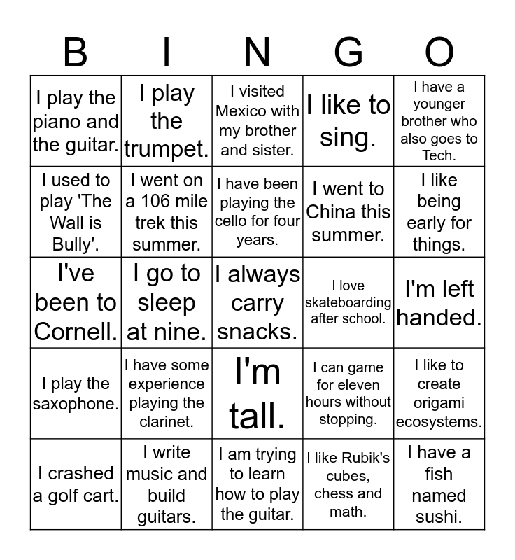 This bingo card has 25 words: I have some experience playing the clarinet., I am trying to learn how to play the guitar., I have been playing the cello for four years., I crashed a golf cart., I have a younger brother who also goes to Tech., I play the piano and the guitar., I used to play 'The Wall is Bully'., I play the trumpet., I love skateboarding after school., I'm tall., I went to China this summer., I've been to Cornell., I can game for eleven hours without stopping., I like to create origami ecosystems., I went on a 106 mile trek this summer., I have a fish named sushi., I'm left handed., I visited Mexico with my brother and sister., I like being early for things., I go to sleep at nine., I always carry snacks., I write music and build guitars., I play the saxophone., I like to sing. and I like Rubik's cubes, chess and math..