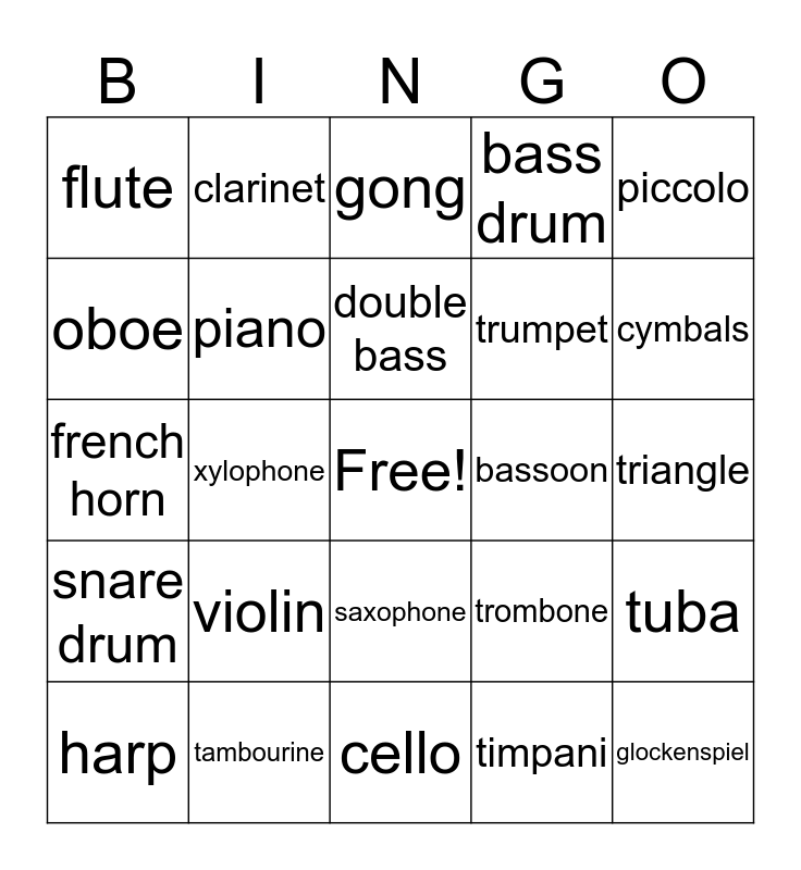 This bingo card has a free space and 25 words: violin, cello, double bass, harp, piccolo, flute, oboe, clarinet, bassoon, saxophone, trumpet, french horn, trombone, tuba, piano, organ, triangle, gong, cymbals, xylophone, glockenspiel, tambourine, snare drum, bass drum and timpani.