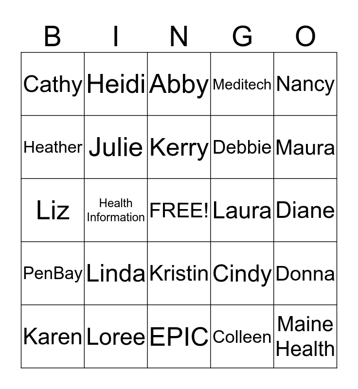 This bingo card has a free space and 24 words: Linda, Loree, Kerry, Karen, Nancy, Cathy, Heather, Heidi, Laura, Kristin, Debbie, Liz, Cindy, Donna, Julie, Colleen, Diane, Abby, Maura, Health Information, Maine Health, PenBay, Meditech and EPIC.