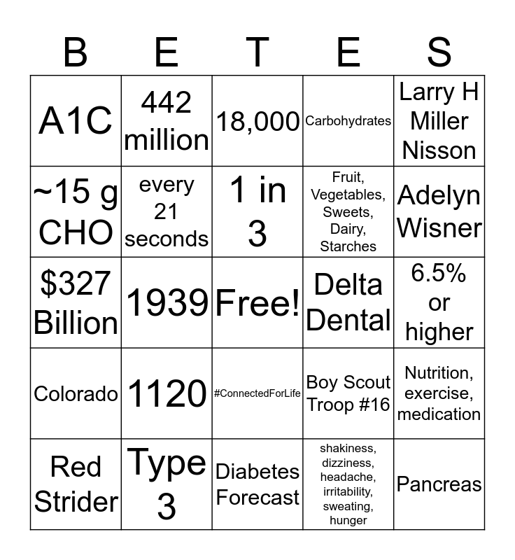 This bingo card has a free space and 33 words: 15g, Auto-immune, 1939, 9.80%, Colorado, every 21 seconds, Larry H Miller Nisson, Red Strider, 442 million, 30 minutes, 1 in 3, 18,000, Parker Adventist Hospital, #tdcco, Delta Dental, Adelyn Wisner, Type 3, $327 Billion, 1120, Boy Scout Troop #16, #ConnectedForLife, CGM, A1C, 6.5% or higher, Diabetes Forecast, Pancreas, Carbohydrates, Fruit, Vegetables, Sweets, Dairy, Starches, ~15 g CHO, Nutrition, exercise, medication, <70 mg/dL, shakiness, dizziness, headache, irritability, sweating, hunger and islet.