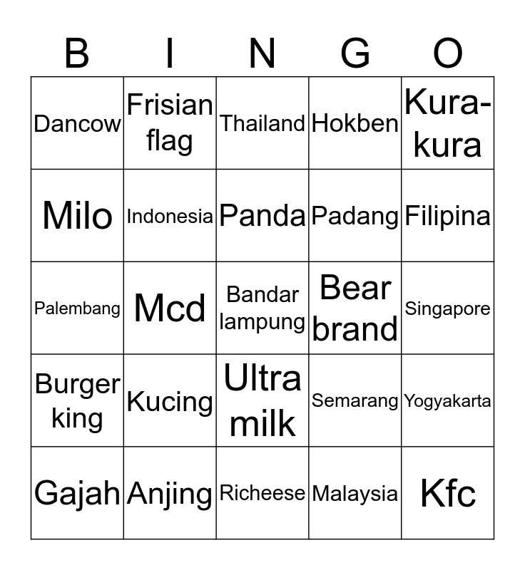 This bingo card has a free space and 24 words: Kucing, Anjing, Panda, Gajah, Kura-kura, Dancow, Milo, Frisian flag, Bear brand, Ultra milk, Padang, Palembang, Semarang, Yogyakarta, Indonesia, Malaysia, Singapore, Thailand, Filipina, Mcd, Kfc, Burger king, Hokben and Richeese.
