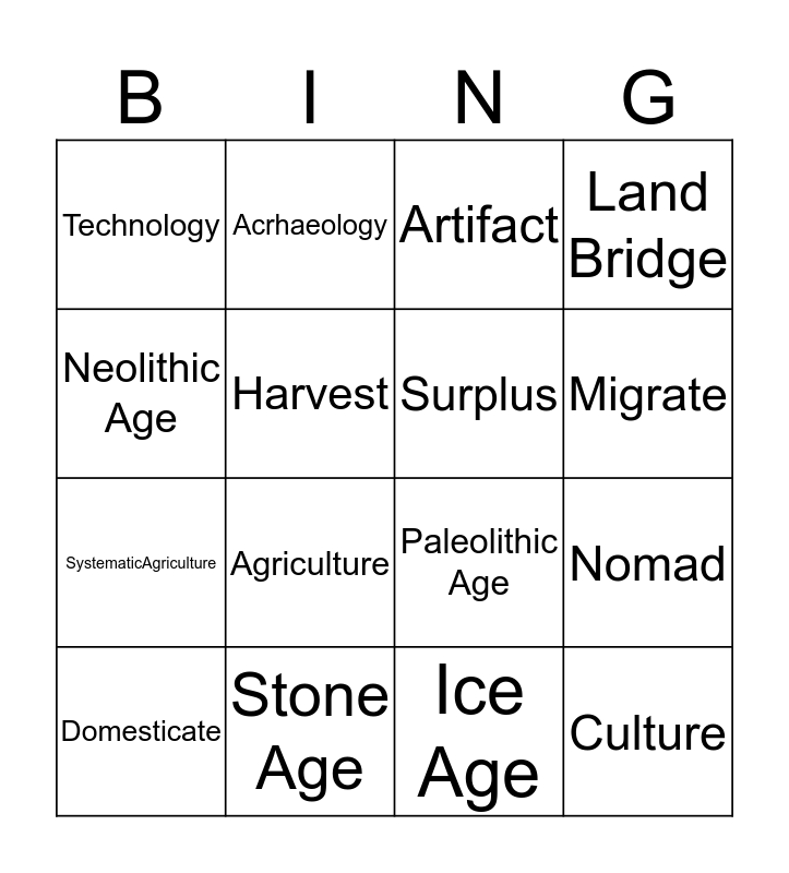 This bingo card has 18 words: Agriculture, Culture, Artifact, Technology, Paleolithic Age, Land Bridge, Domesticate, Acrhaeology, Migrate, SystematicAgriculture, Ice Age, Neolithic Age, Nomad, Harvest, Surplus, Hunter-Gatherer, Stone Age and Prehistory.