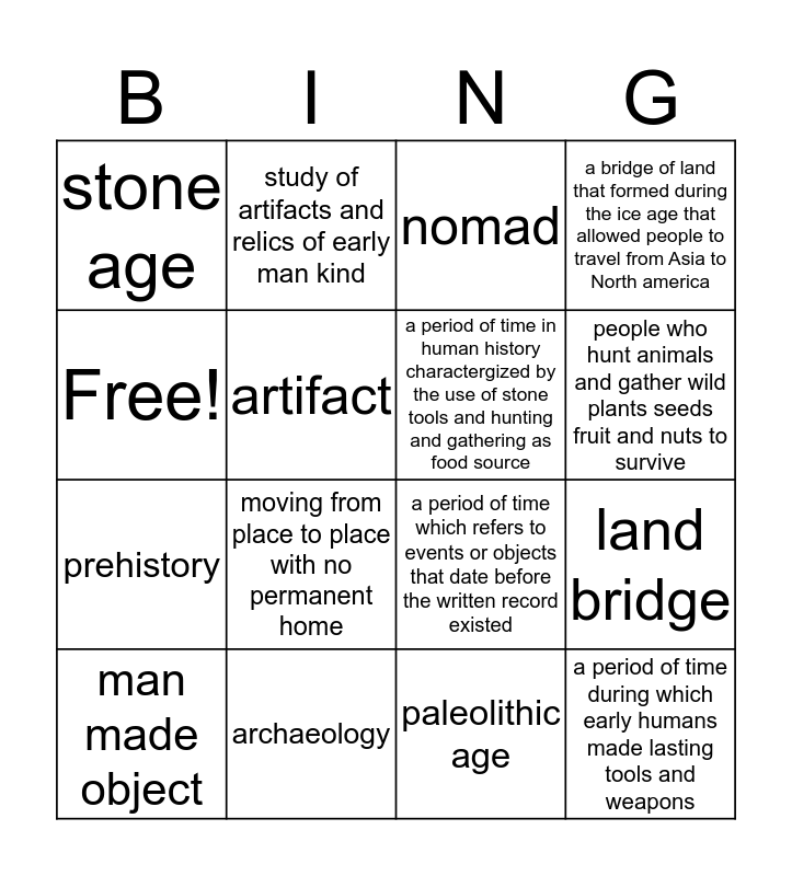 This bingo card has 16 words: archaeology, land bridge, nomad, stone age, prehistory, study of artifacts and relics of early man kind, a period of time which refers to events or objects that date before the written record existed, paleolithic age, Free!, artifact, man made object, a bridge of land that formed during the ice age that allowed people to travel from Asia to North america, moving from place to place with no permanent home, people who hunt animals and gather wild plants seeds fruit and nuts to survive, a period of time in human history charactergized by the use of stone tools and hunting and gathering as food source and a period of time during which early humans made lasting tools and weapons.