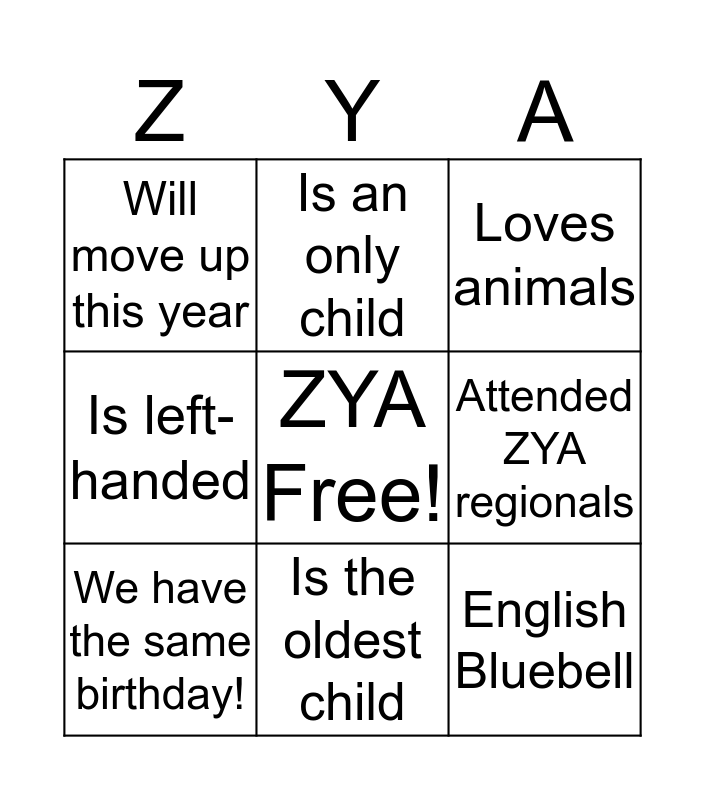 This bingo card has a free space and 11 words: For-Get-Me-Not, Is the oldest child, English Bluebell, We have the same birthday!, Is an only child, Loves animals, Attended ZYA regionals, Tulips, Is left-handed, Will move up this year and Can name 3 Youth Advisors.