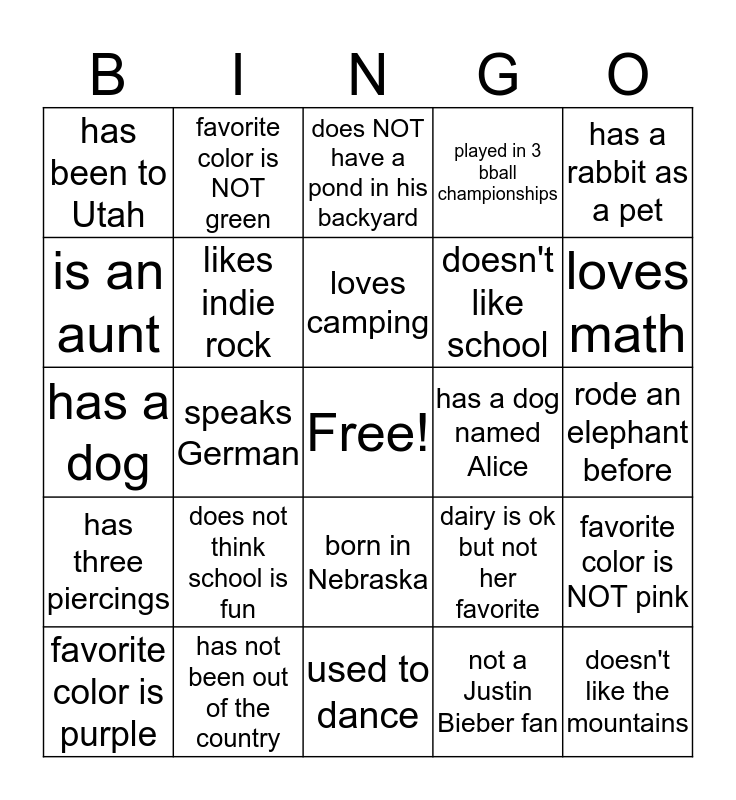 This bingo card has a free space and 24 words: does not think school is fun, has not been out of the country, loves camping, favorite color is purple, has a rabbit as a pet, has been to Utah, is an aunt, favorite color is NOT green, has a dog named Alice, born in Nebraska, doesn't like school, has a dog, dairy is ok but not her favorite, favorite color is NOT pink, likes indie rock, not a Justin Bieber fan, rode an elephant before, does NOT have a pond in his backyard, loves math, speaks German, doesn't like the mountains, has three piercings, played in 3 bball championships and used to dance.