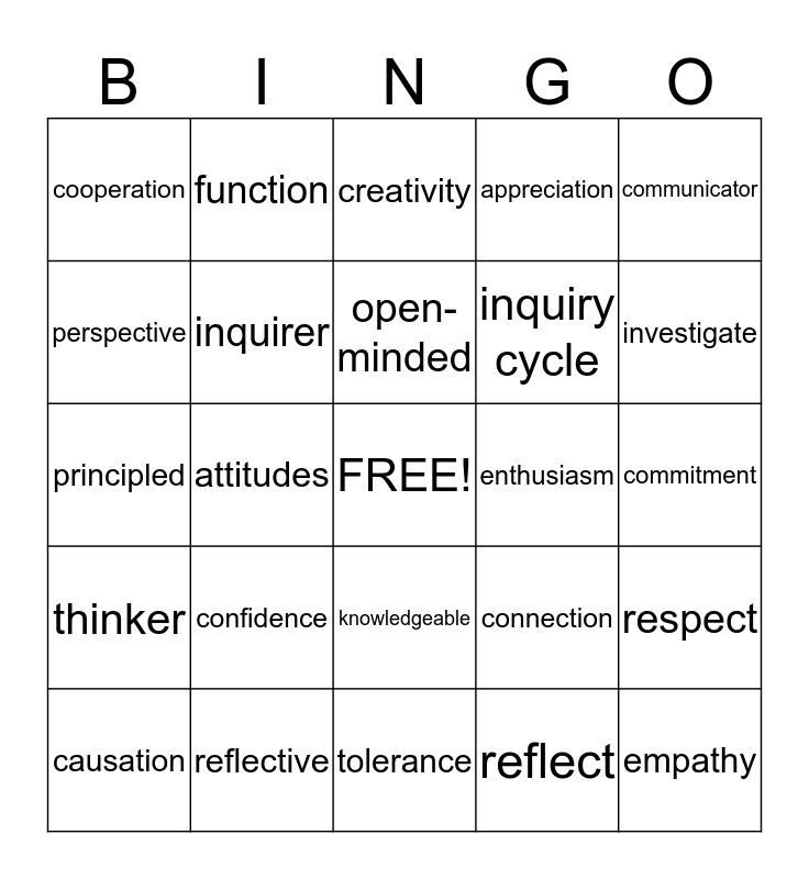 This bingo card has a free space and 41 words: balanced, principled, caring, inquirer, reflective, knowledgeable, open-minded, risk taker, communicator, thinker, attitudes, appreciation, empathy, commitment, enthusiasm, confidence, independence, cooperation, integrity, creativity, respect, curiosity, tolerance, inquiry cycle, create, discuss, reflect, ask, investigate, action, form, function, causation, change, connection, perspective, responsibility, reflection, lines of inquiry, central idea and key concepts.