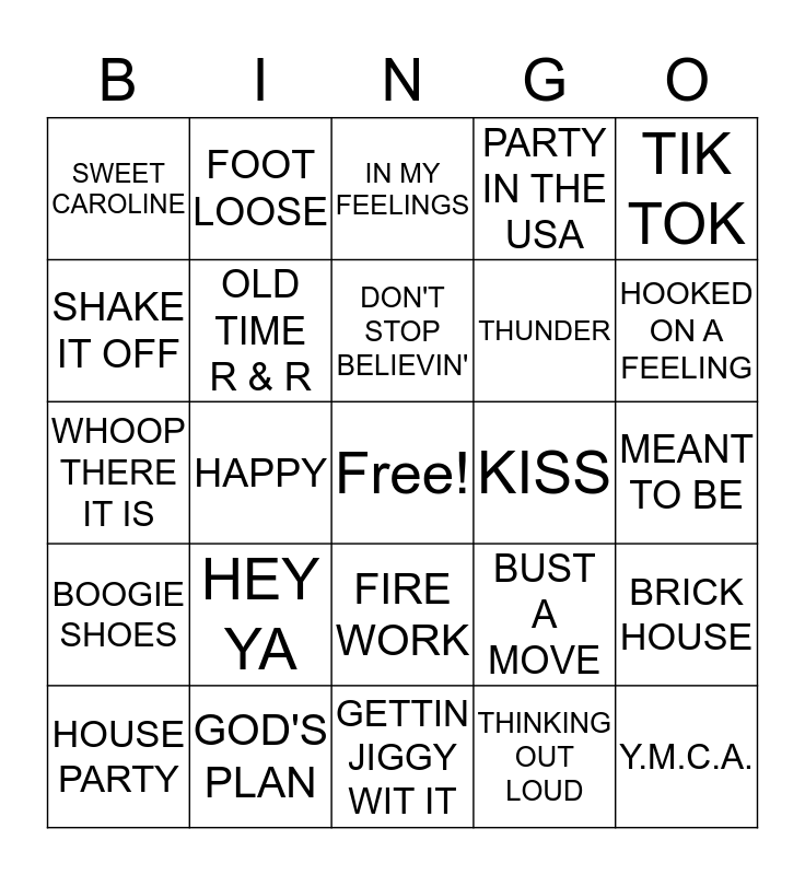 This bingo card has a free space and 27 words: BUST A MOVE, BEAT IT, THUNDER, GETTIN JIGGY WIT IT, SHAKE IT OFF, IN MY FEELINGS, FOOT LOOSE, BOOGIE SHOES, KISS, BRICK HOUSE, WHOOP THERE IT IS, PARTY IN THE USA, HOUSE PARTY, GOD'S PLAN, HOOKED ON A FEELING, SORRY NOT SORRY, OLD TIME R & R, DON'T STOP BELIEVIN', HEY YA, SWEET CAROLINE, MEANT TO BE, THINKING OUT LOUD, HAPPY, Y.M.C.A., FIRE WORK, TIK TOK and SAVE A HORSE.