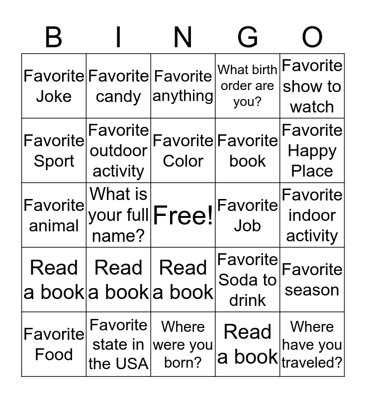 This bingo card has a free space and 24 words: Read a book, Favorite state in the USA, Favorite Color, Favorite Food, Favorite show to watch, Favorite Joke, Favorite Sport, Favorite candy, Favorite Job, Read a book, Favorite book, Favorite animal, Favorite Soda to drink, Favorite season, Favorite outdoor activity, Read a book, Favorite indoor activity, Favorite anything, Favorite Happy Place, What is your full name?, Where have you traveled?, Read a book, What birth order are you? and Where were you born?.