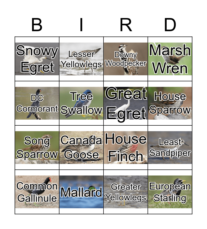 This bingo card has 21 images and 21 words: Mallard, Mourning Dove, Lesser Yellowlegs, Short-Billed Dowitcher, Greater Yellowlegs, Great Egret, Snowy Egret, Downy Woodpecker, House Finch, House Sparrow, Song Sparrow, Marsh Wren, European Starling, Gray Catbird, Tree Swallow, Least Bittern, Common Gallinule, Canada Goose, DC Cormorant, Least Sandpiper and Semipalmated Sandpiper.