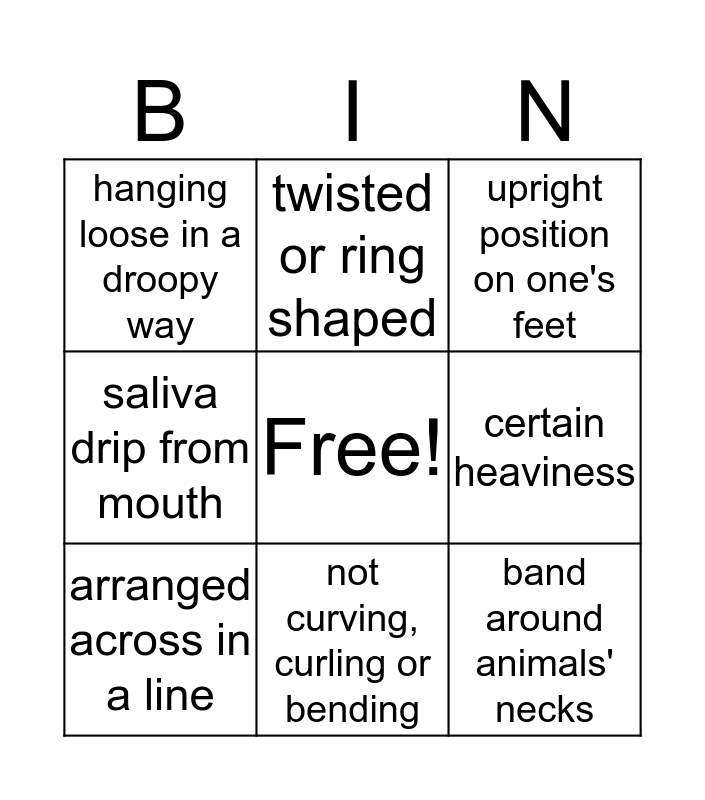 This bingo card has a free space and 8 words: certain heaviness, upright position on one's feet, twisted or ring shaped, arranged across in a line, hanging loose in a droopy way, band around animals' necks, saliva drip from mouth and not curving, curling or bending.