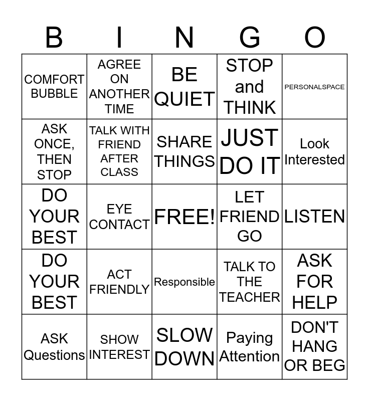 This bingo card has a free space and 24 words: ACT FRIENDLY, SHOW INTEREST, SHARE THINGS, ASK Questions, PERSONALSPACE, COMFORT BUBBLE, ASK ONCE, THEN STOP, AGREE ON ANOTHER TIME, LET FRIEND GO, Responsible, JUST DO IT, DO YOUR BEST, TALK TO THE TEACHER, ASK FOR HELP, TALK WITH FRIEND AFTER CLASS, Paying Attention, LISTEN, BE QUIET, Look Interested, EYE CONTACT, DON'T HANG OR BEG, DO YOUR BEST, STOP and THINK and SLOW DOWN.