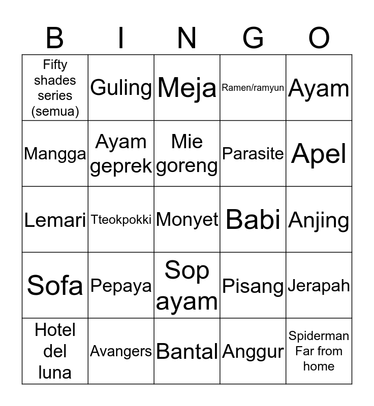 This bingo card has 25 words: Pepaya, Bantal, Mie goreng, Hotel del luna, Ayam, Fifty shades series (semua), Mangga, Guling, Babi, Sop ayam, Parasite, Lemari, Pisang, Jerapah, Ayam geprek, Spiderman Far from home, Anjing, Meja, Apel, Tteokpokki, Monyet, Avangers, Sofa, Ramen/ramyun and Anggur.