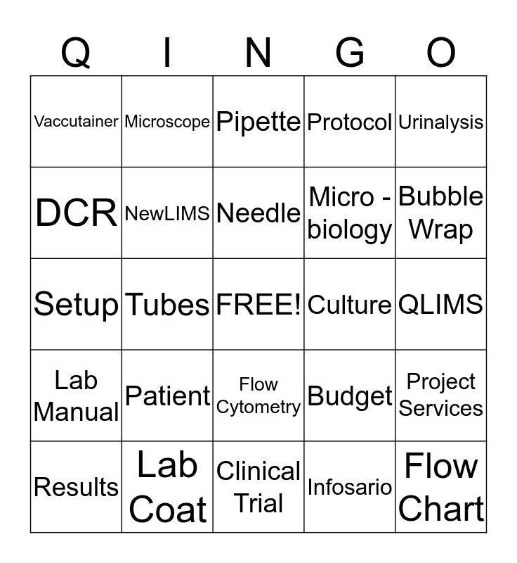 This bingo card has a free space and 24 words: Patient, Lab Coat, Needle, Results, Urinalysis, Vaccutainer, DCR, Microscope, Culture, Flow Cytometry, Micro -biology, Setup, Budget, Project Services, NewLIMS, Infosario, QLIMS, Pipette, Bubble Wrap, Tubes, Flow Chart, Lab Manual, Protocol and Clinical Trial.