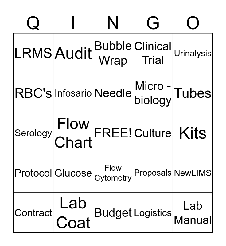 This bingo card has a free space and 24 words: Glucose, Lab Coat, Needle, Contract, Urinalysis, LRMS, RBC's, Audit, Culture, Flow Cytometry, Micro -biology, Serology, Proposals, NewLIMS, Infosario, Logistics, Kits, Bubble Wrap, Tubes, Flow Chart, Lab Manual, Protocol, Clinical Trial and Budget.