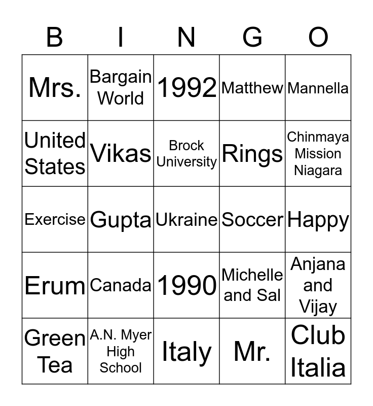 This bingo card has 50 words: Wedding, Ukraine, Serbia, Italy, Canada, India, Bargain World, Centre Gift Shop, United States, Anuj, Vikas, Matthew, Anjana and Vijay, Michelle and Sal, Speech Therapy, Business, Brock University, Soccer, September 26, 2020, Mannella, Gupta, Mr., Mrs., Rings, Our Lady of the Scapular Church, Club Italia, Chinmaya Mission Niagara, Travel, 1992, 1990, Super Souvenirs, Discount Souvenirs, Sonu (Arjun), Saint Paul High School, A.N. Myer High School, Netflix, Going for walks, Shopping, Piano, Happy, Biceps, Kohl's, $ Cha-Ching, Mexican Food, Green Tea, Exercise, Step Overs, "It's Okay", Erum and Victoria.