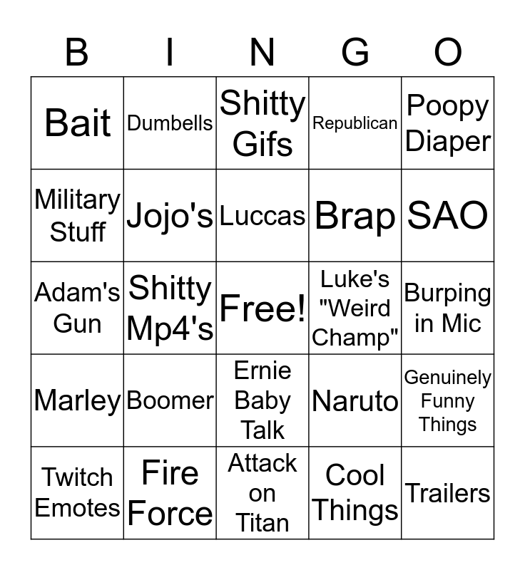 This bingo card has a free space and 24 words: Boomer, Fire Force, Luccas, Twitch Emotes, Poopy Diaper, Bait, Military Stuff, Dumbells, Luke's "Weird Champ", Ernie Baby Talk, Brap, Adam's Gun, Naruto, Genuinely Funny Things, Jojo's, Cool Things, Burping in Mic, Shitty Gifs, SAO, Shitty Mp4's, Trailers, Marley, Republican and Attack on Titan.
