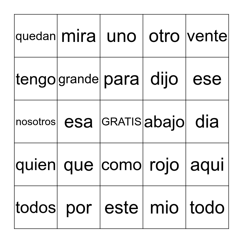 This bingo card has a free space and 24 words: que, por, para, todos, vente, quedan, tengo, mira, abajo, como, dijo, nosotros, rojo, aqui, grande, mio, dia, uno, ese, esa, todo, quien, otro and este.