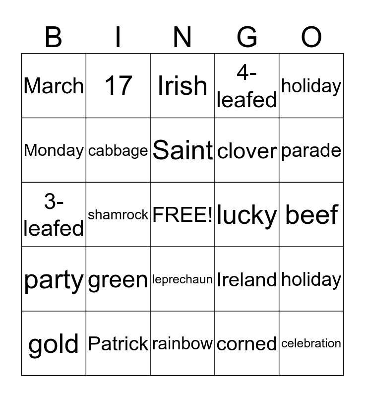 This bingo card has a free space and 24 words: green, Patrick, Saint, gold, holiday, March, Monday, 17, lucky, leprechaun, clover, 3-leafed, Ireland, holiday, cabbage, corned, beef, Irish, parade, shamrock, celebration, party, 4-leafed and rainbow.