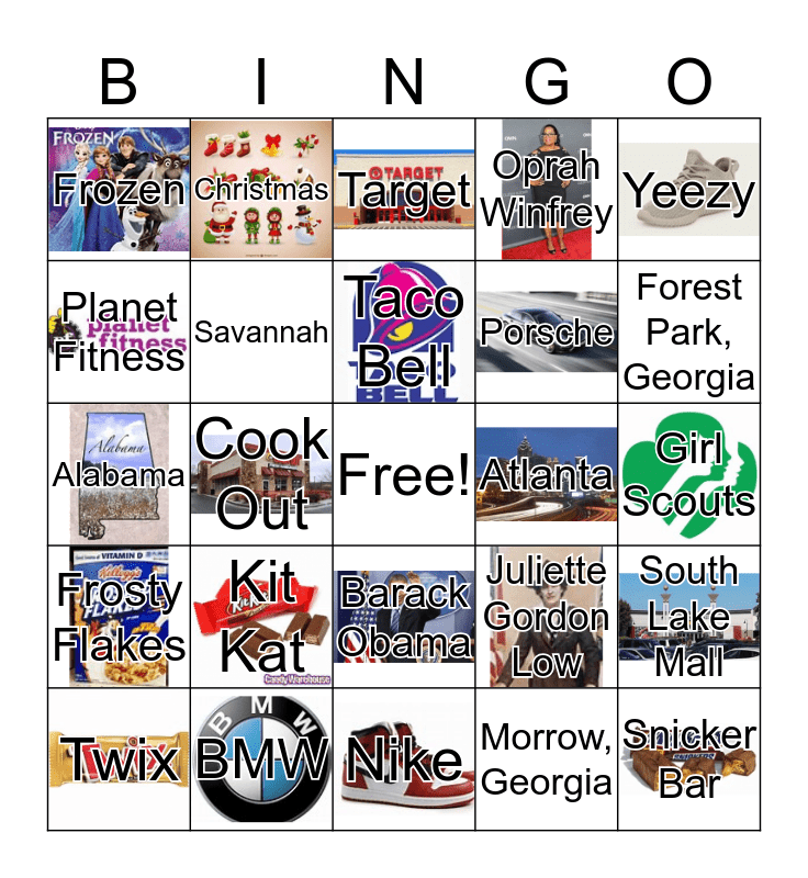 This bingo card has 23 images, a free space and 29 words: Lake City, Georgia, BMW, Target, 1826 Appletree Road, Yeezy, Frozen, Savannah, Taco Bell, Atlanta, South Lake Mall, Twix, Cook Out, Morrow, Georgia, Snicker Bar, Alabama, B.C. Haynie, Nike, Juliette Gordon Low, Forest Park, Georgia, Frosty Flakes, Kit Kat, Wal-Mart, Porsche, Girl Scouts, Planet Fitness, Christmas, Barack Obama, Oprah Winfrey and Brain Kemp.