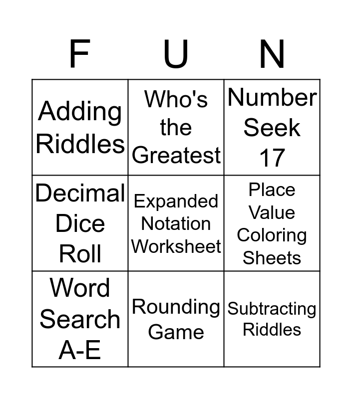 This bingo card has a free space and 8 words: Place Value Coloring Sheets, Number Seek 17, Who's the Greatest, Word Search A-E, Adding Riddles, Subtracting Riddles, Decimal Dice Roll and Rounding Game.