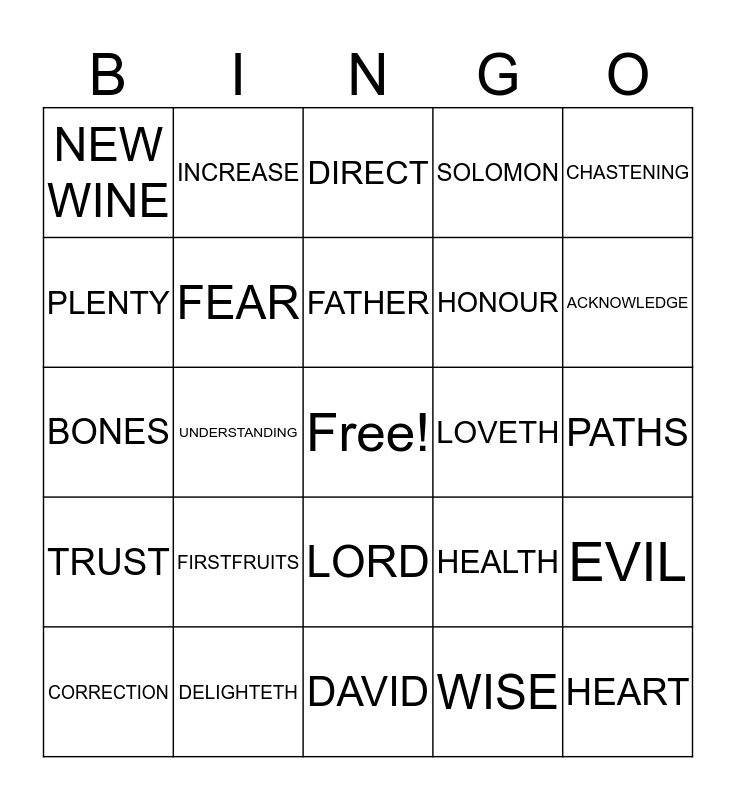 This bingo card has a free space and 24 words: FIRSTFRUITS, DELIGHTETH, FATHER, CORRECTION, CHASTENING, NEW WINE, PLENTY, INCREASE, LOVETH, LORD, HONOUR, BONES, HEALTH, EVIL, FEAR, WISE, PATHS, DIRECT, ACKNOWLEDGE, UNDERSTANDING, HEART, TRUST, SOLOMON and DAVID.