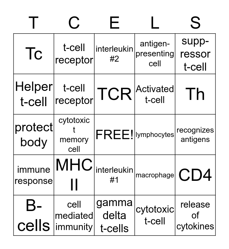 This bingo card has a free space and 24 words: MHC II, cell mediated immunity, TCR, B-cells, supp- ressor t-cell, Tc, Helper t-cell, t-cell receptor, lymphocytes, interleukin #1, Activated t-cell, protect body, macrophage, CD4, t-cell receptor, cytotoxic t-cell, recognizes antigens, interleukin #2, Th, cytotoxic t memory cell, release of cytokines, immune response, antigen- presenting cell and gamma delta t-cells.