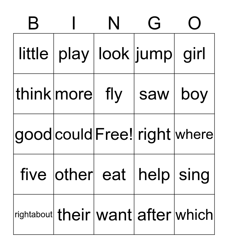 This bingo card has a free space and 29 words: rightabout, before, could, first, little, look, more, other, right, their, where, which, want, after, boy, day, eat, five, girl, good, help, read, saw, think, jump, play, sing, fly and us.