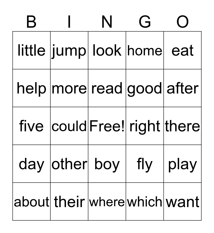 This bingo card has a free space and 29 words: about, before, could, first, little, look, more, other, right, their, there, want, where, which, after, am, boy, day, eat, five, fly, girl, good, help, home, jump, play, read and think.