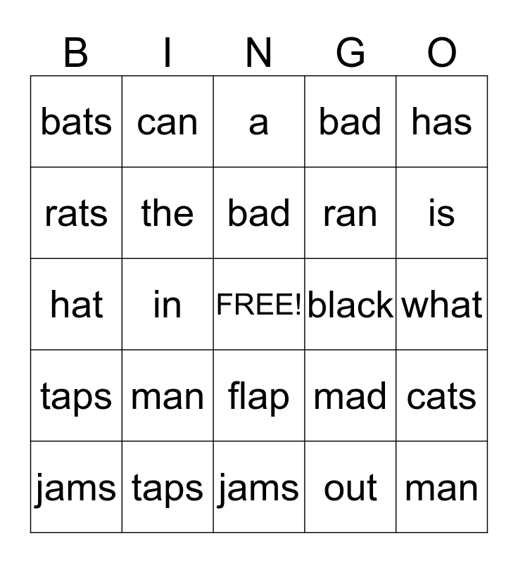 This bingo card has a free space and 24 words: man, taps, bad, jams, has, bats, rats, can, black, flap, ran, hat, mad, cats, the, out, what, a, is, in, man, taps, bad and jams.