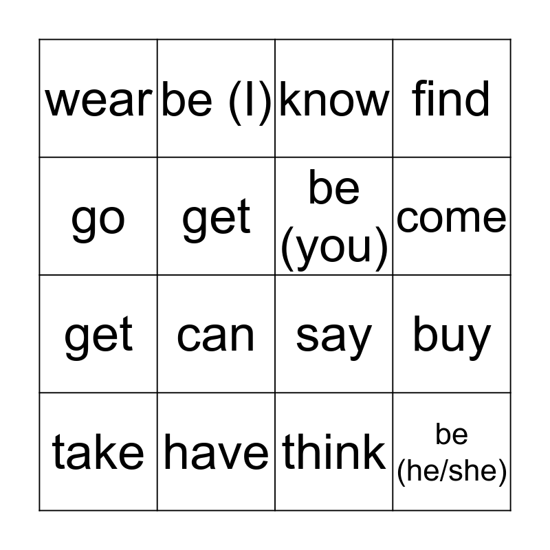 This bingo card has 16 words: have, buy, know, wear, get, be (I), say, think, go, get, take, find, can, come, be (you) and be (he/she).