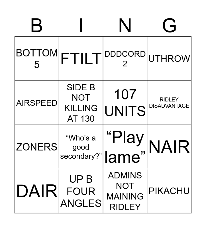 This bingo card has 16 words: DAIR, UP B FOUR ANGLES, DDDCORD 2, UTHROW, AIRSPEED, FTILT, “Play lame”, NAIR, BOTTOM 5, SIDE B NOT KILLING AT 130, ADMINS NOT MAINING RIDLEY, RIDLEY DISADVANTAGE, ZONERS, “Who’s a good secondary?”, 107 UNITS and PIKACHU.